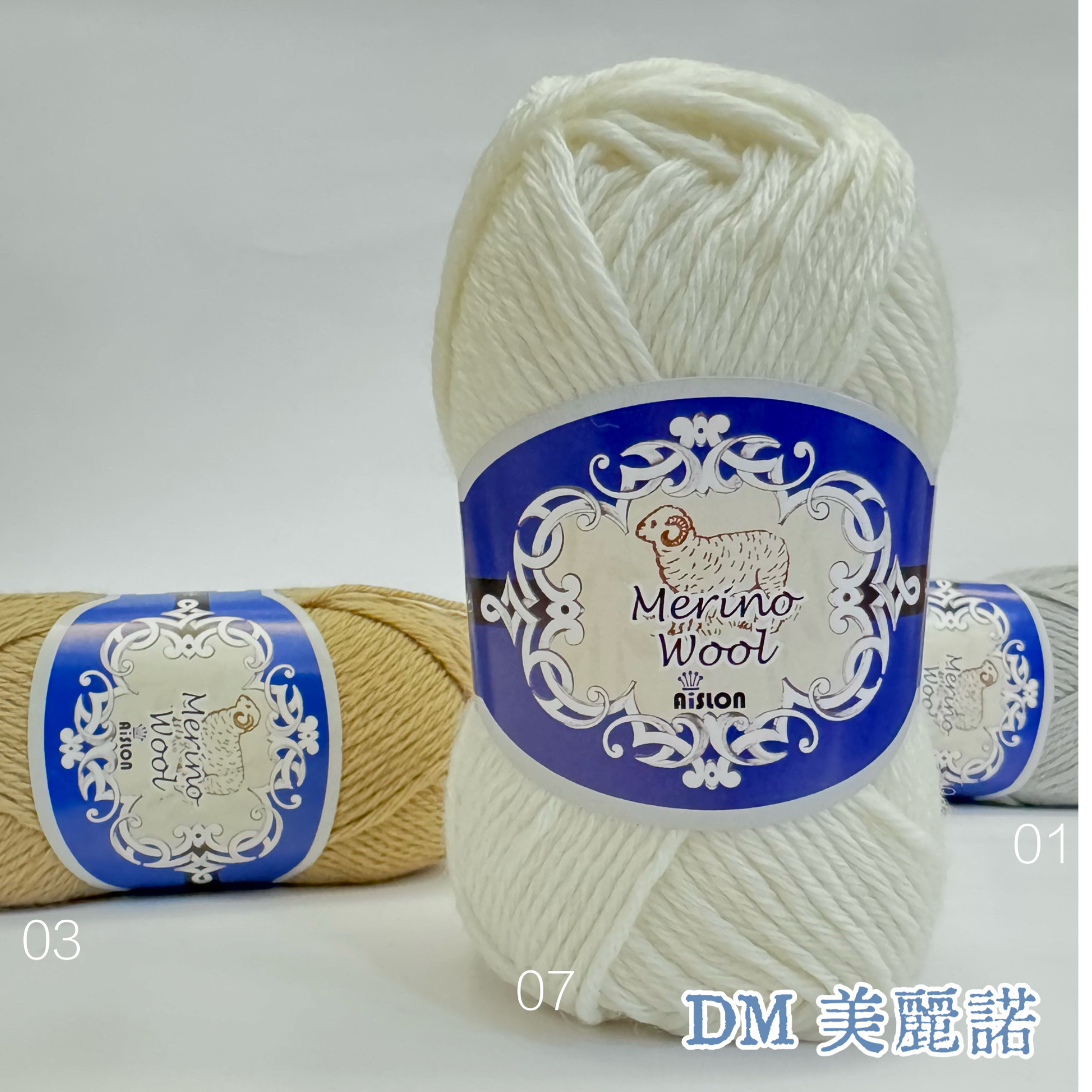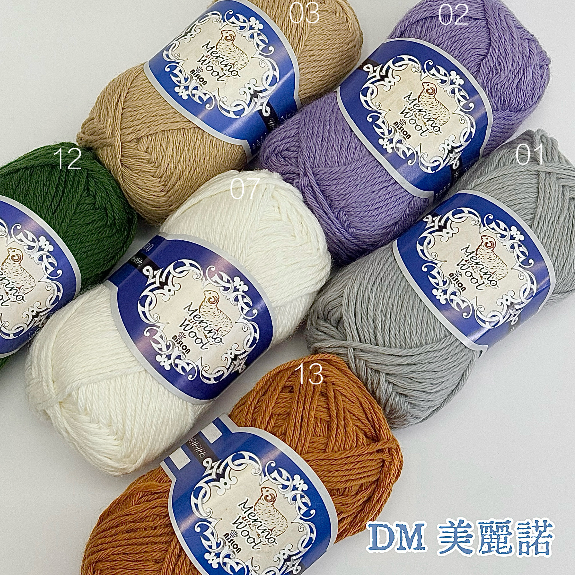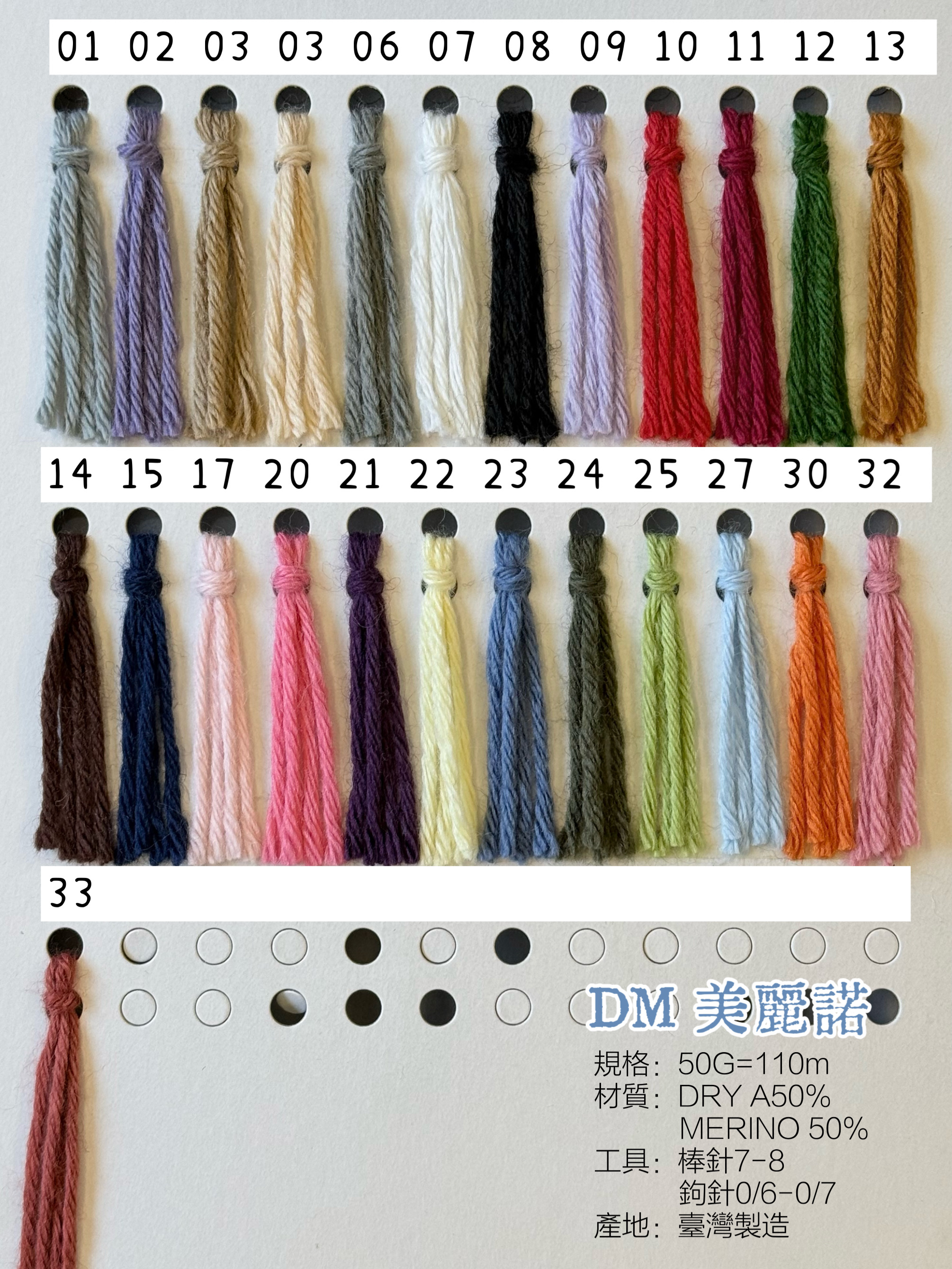 | 美麗諾羊毛 | DM | 50G=110M | ACRYLIC50% MMERINO50% | 共33色 | 10 顆/包 | 勾針5號;棒針6~8號 | 建議售價:100 元/(顆) |