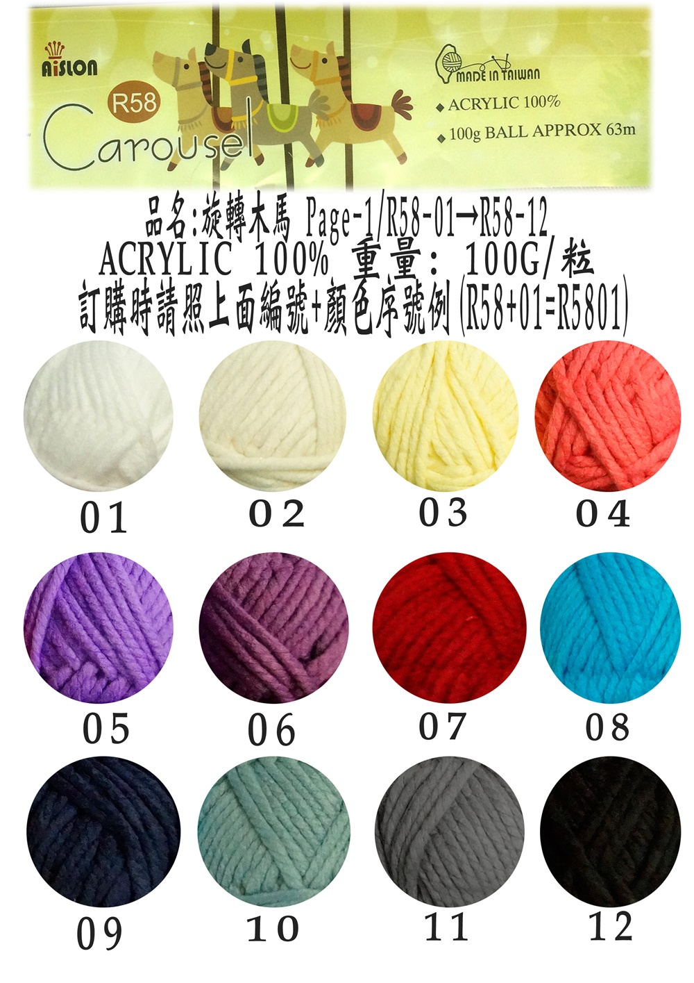 品名 編號 規格 成份 顏色 包裝 適合工具 建議售價 旋轉木馬 R58 100G=63M ACRYLIC100% 共12色 5顆/包 勾針7~8號;棒針12~13號 建議售價:100元/(顆) 色差說明: 由於毛線屬特殊工藝,任何品牌的線材,都無法保證沒有接頭,一團線偶有1~2個接頭,不屬於品質問題,不同時間購買的線可能會有些色差,建議一次購買多些以免補線。
