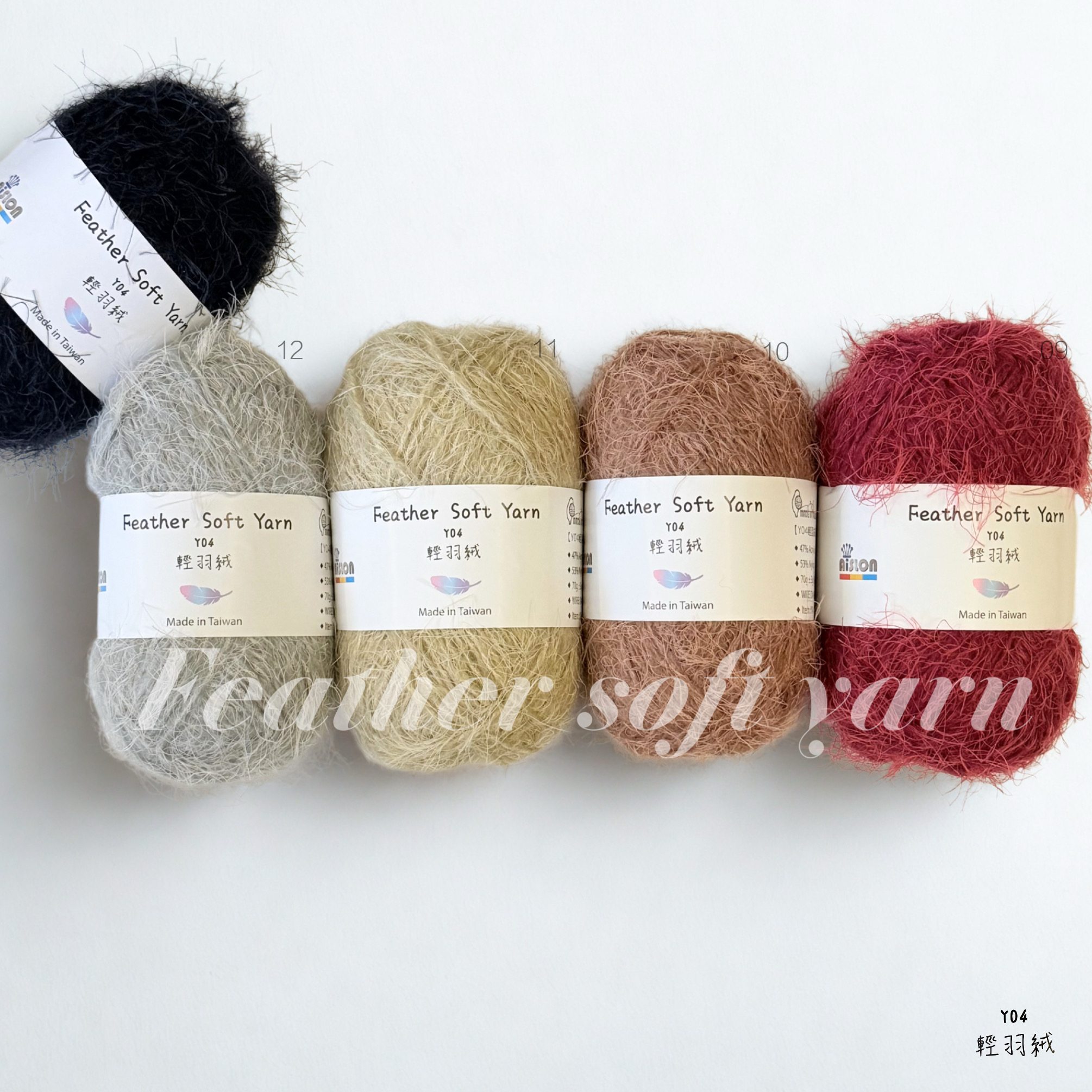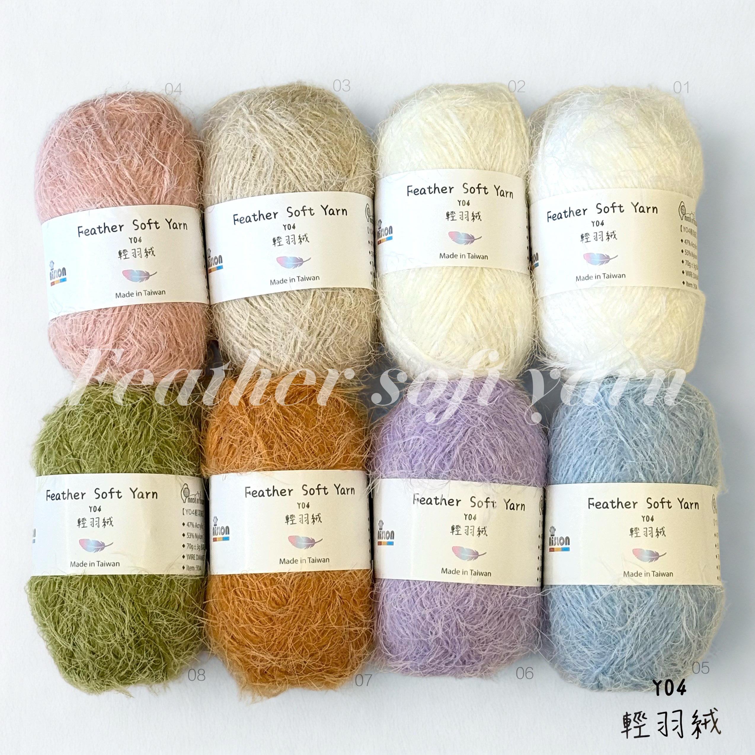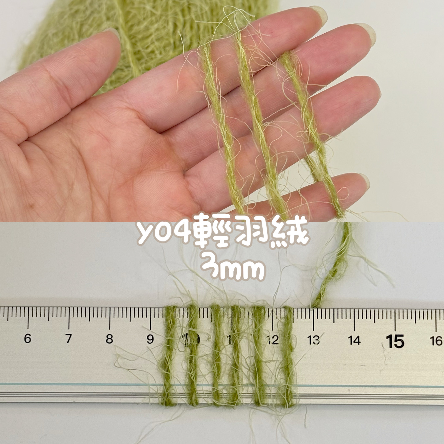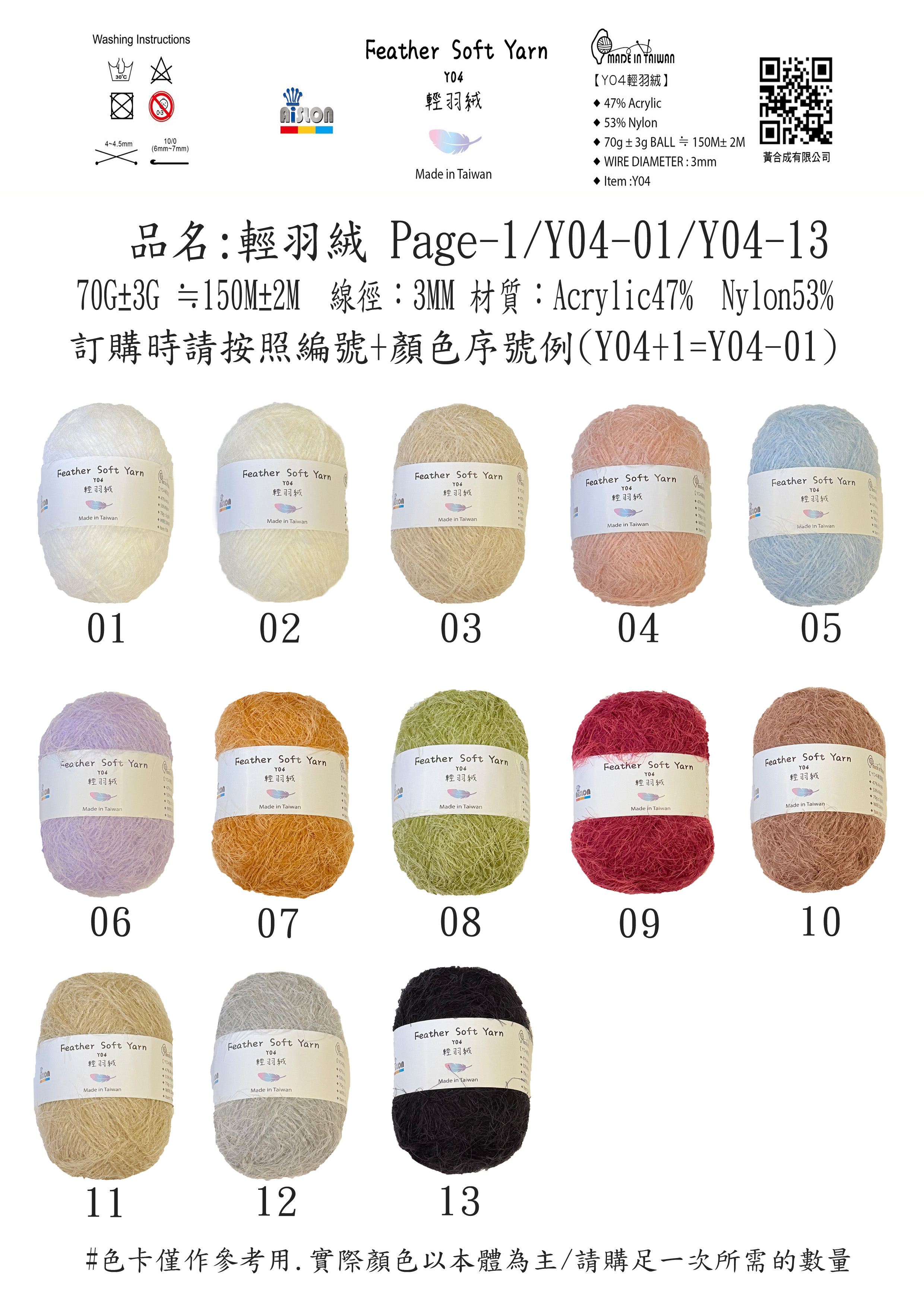 | 輕羽絨 | Y04 | 70G ± 3G ≒ 150M ±2M (線徑:3MM) | ACRYLIC 47% NYLON 53% | 共13色 | 4顆/包 | 勾針6~7mm;棒針4~4.5mm | 建議售價:240元/(顆) |