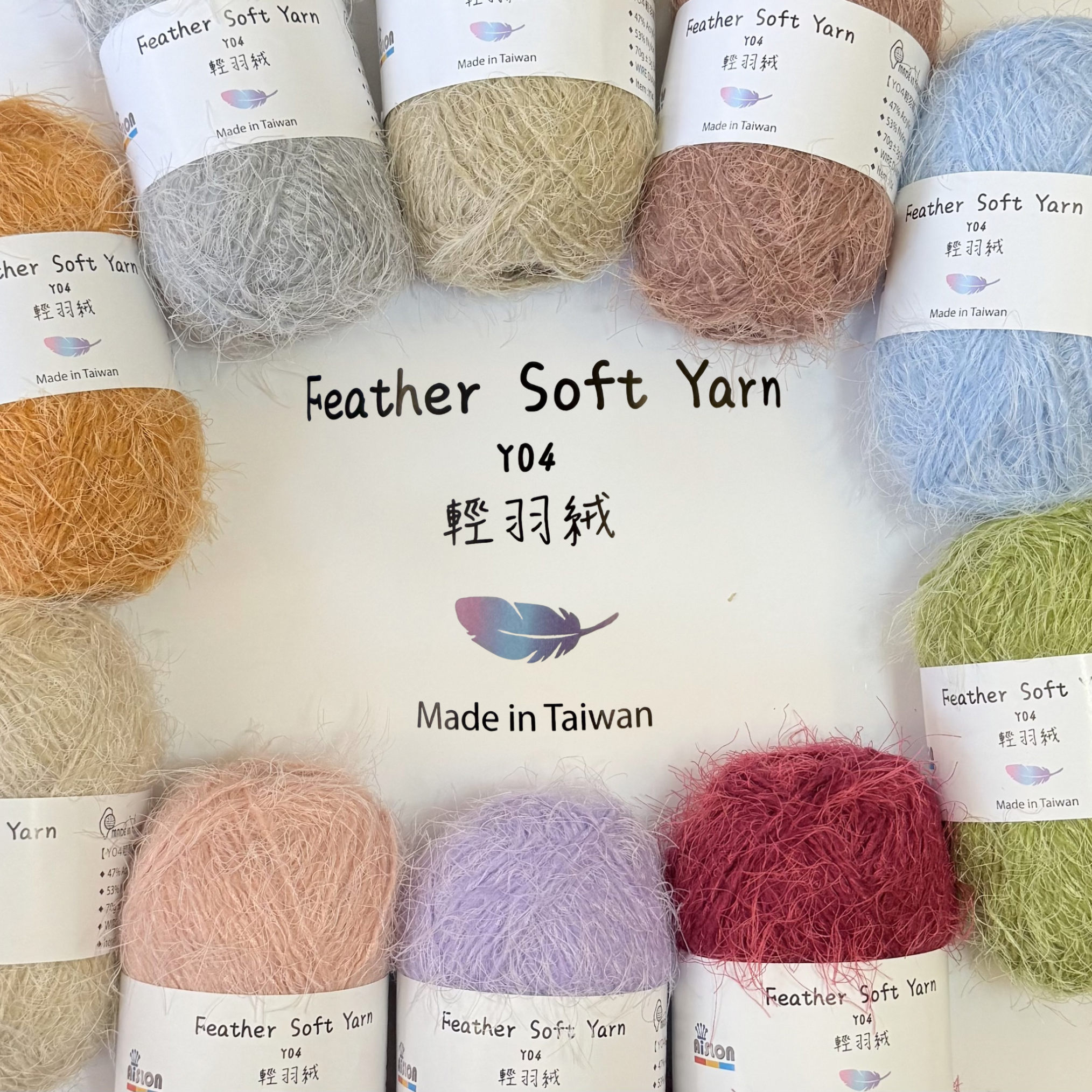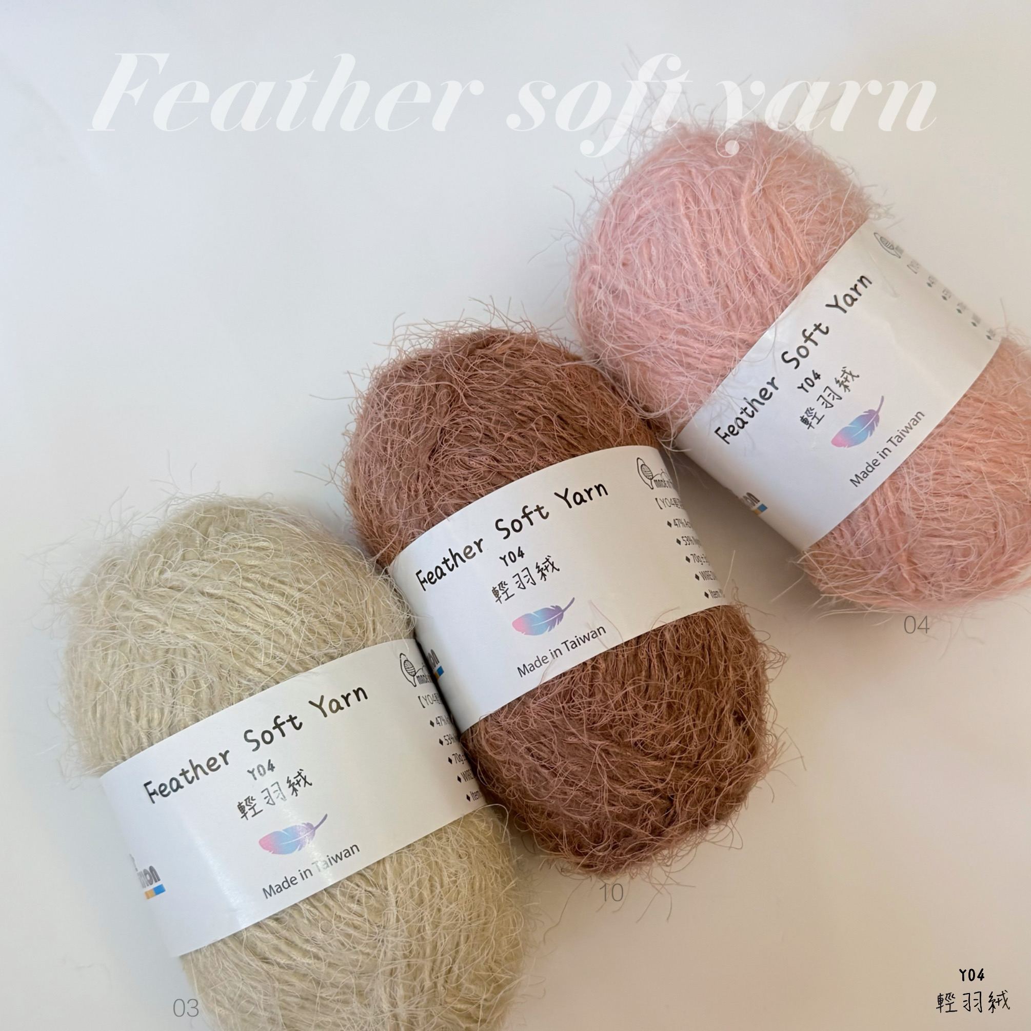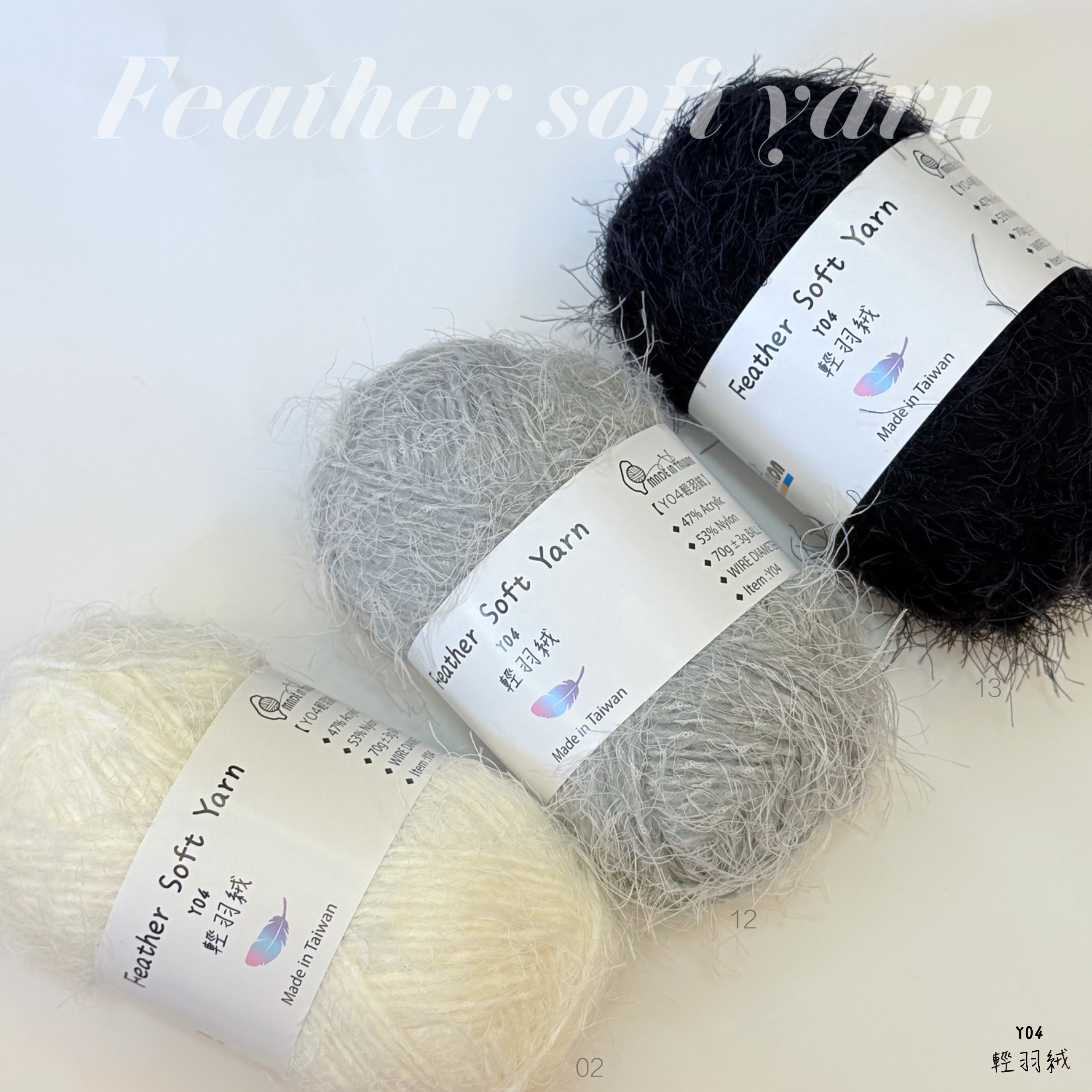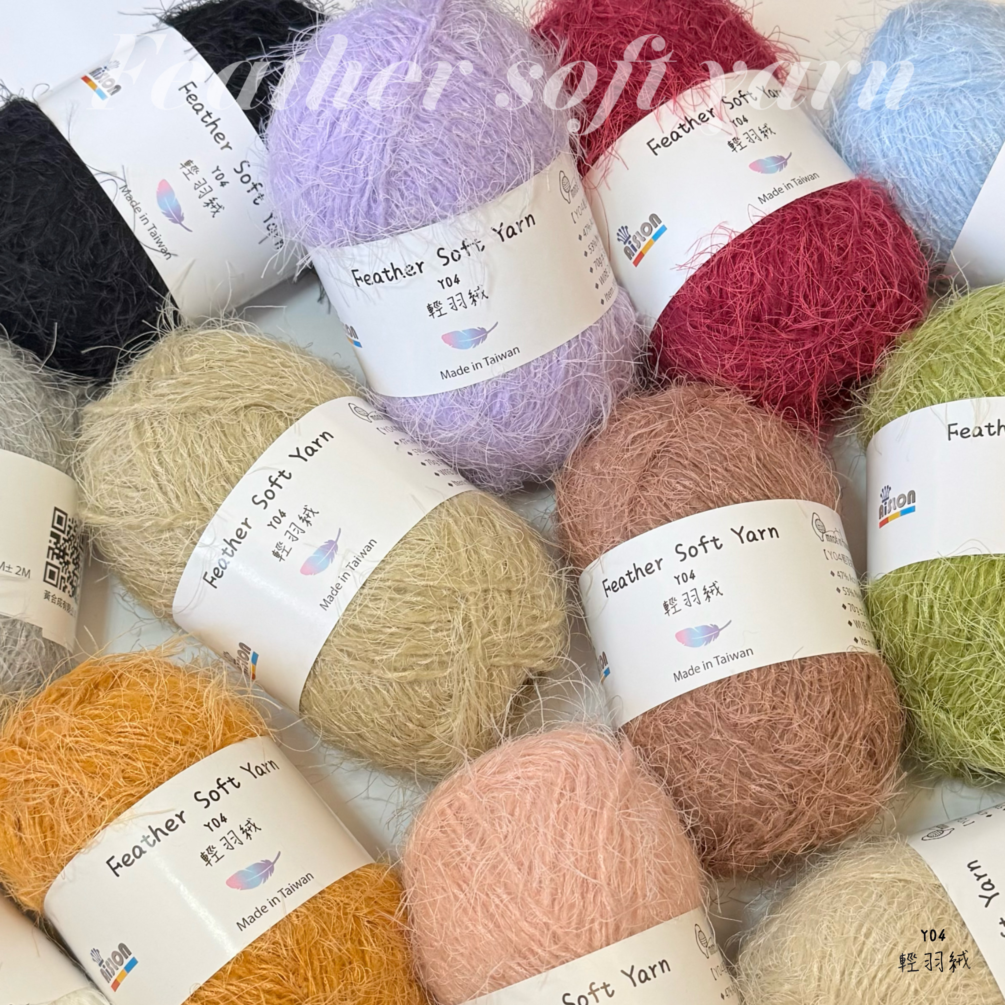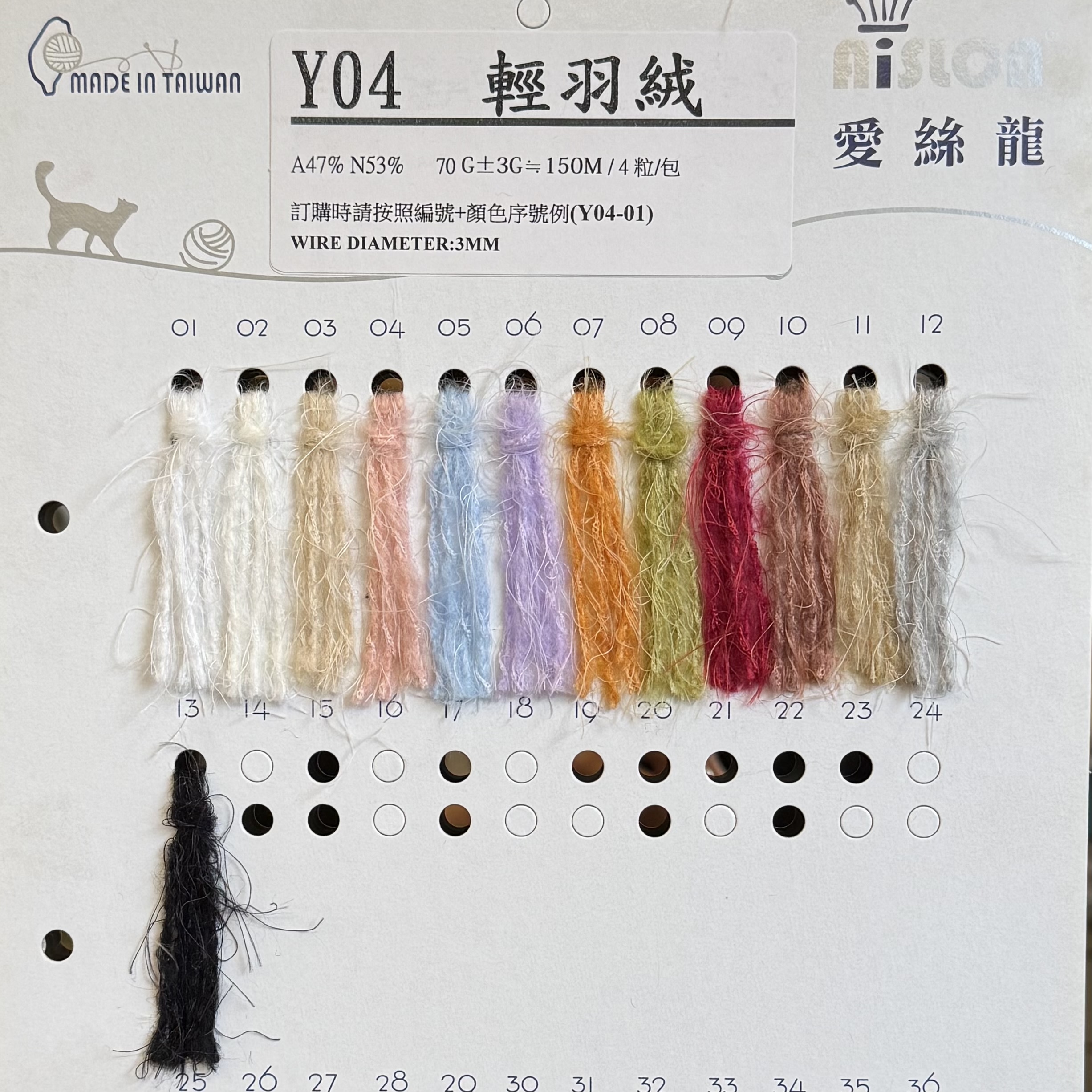 | 輕羽絨 | Y04 | 70G ± 3G ≒ 150M ±2M (線徑:3MM) | ACRYLIC 47% NYLON 53% | 共13色 | 4顆/包 | 勾針6~7mm;棒針4~4.5mm | 建議售價:240元/(顆) |