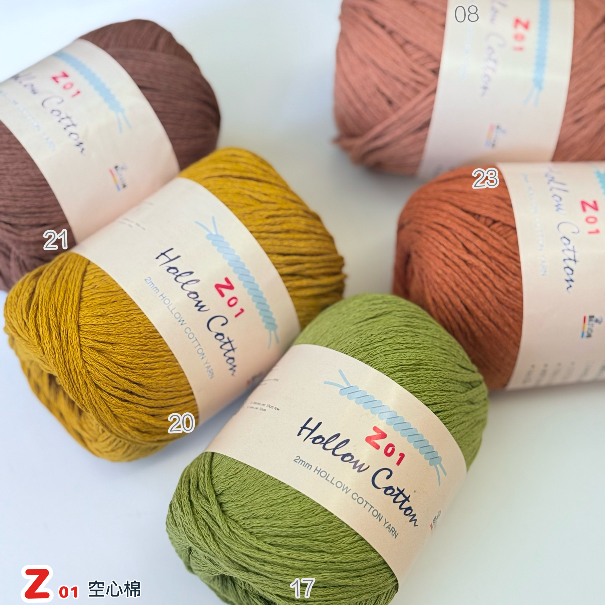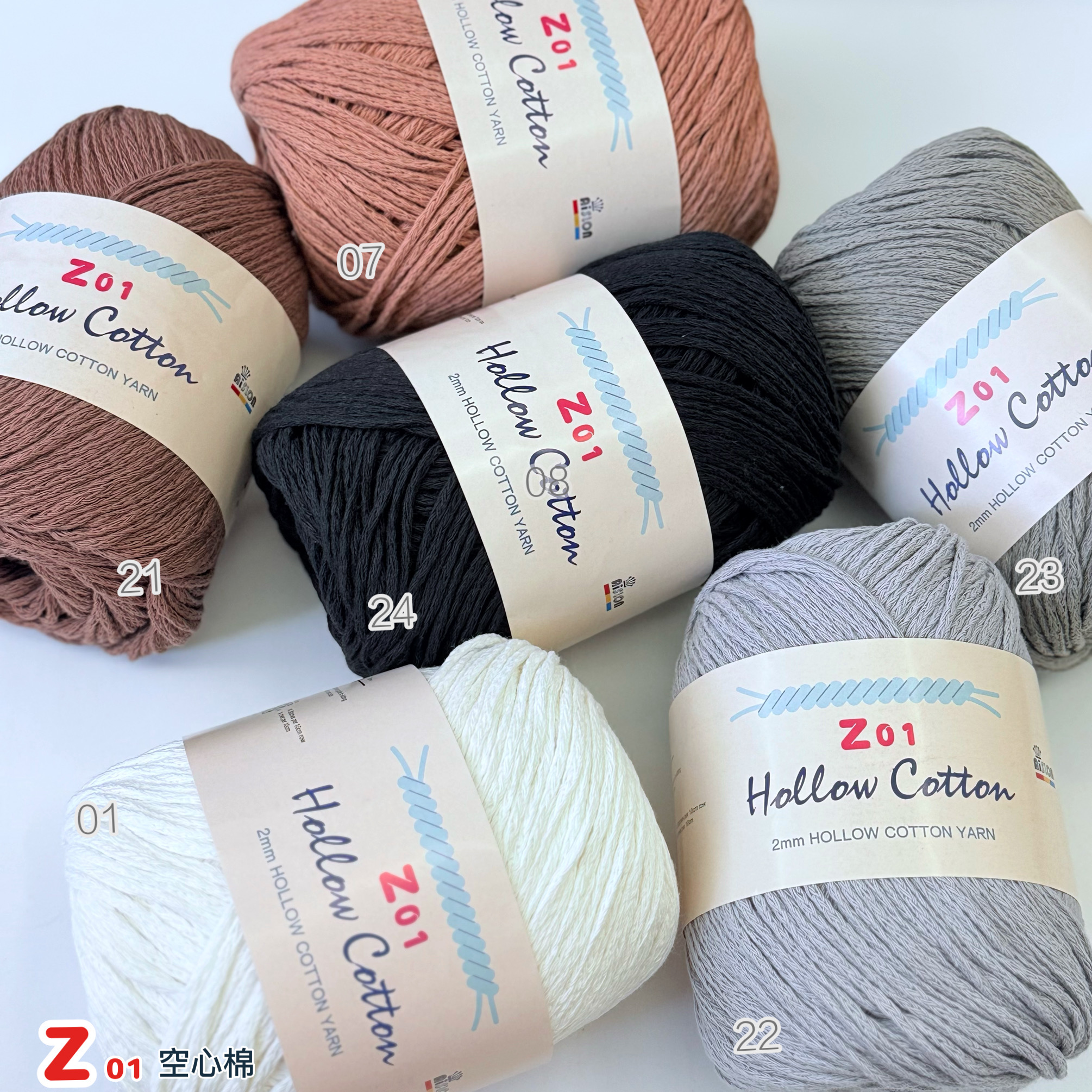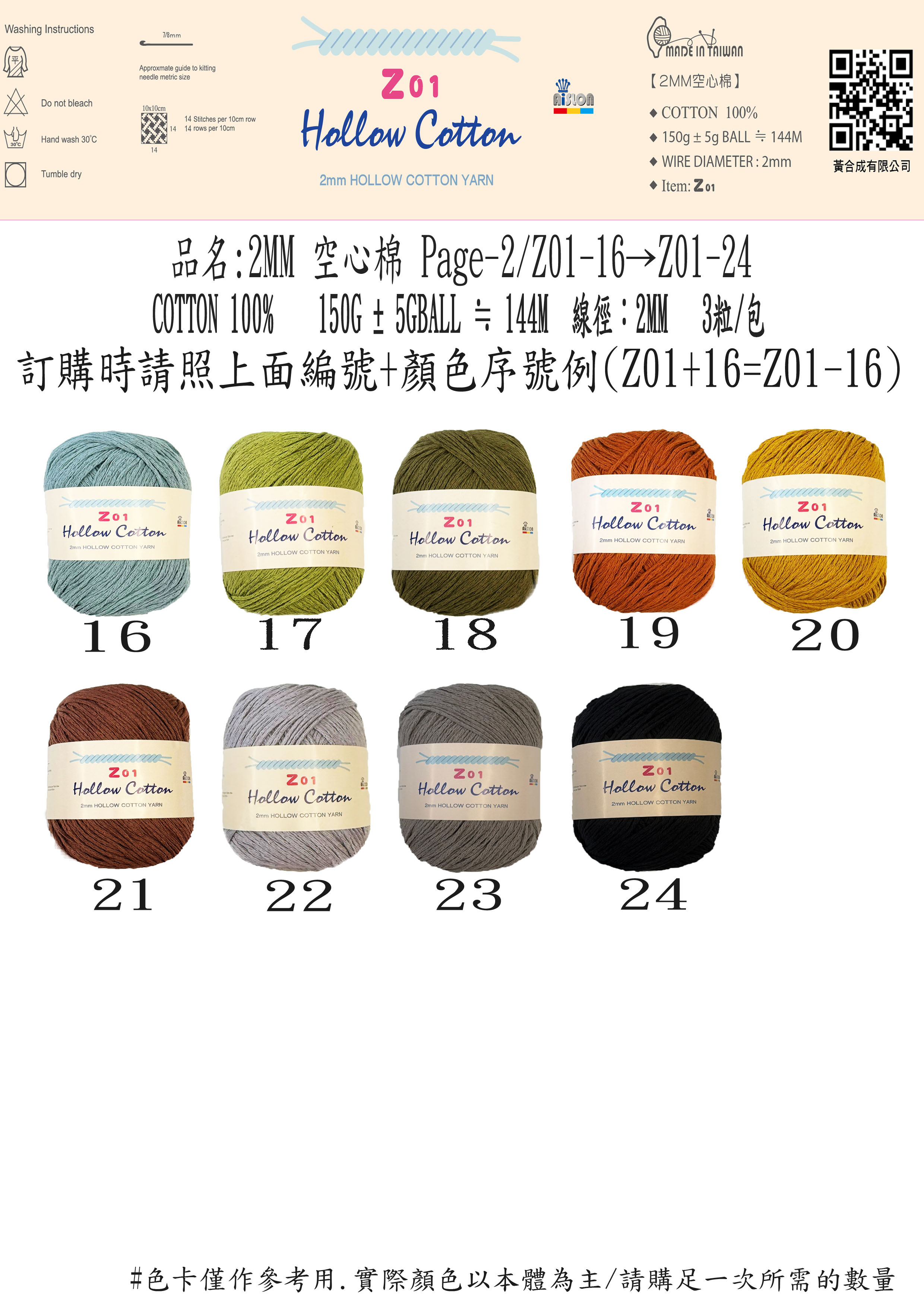 2MM空心棉 Z01 150G ±5G≒144M COTTON100% 共24色 3顆/包 勾針7~8號 建議售價:280元/(顆)