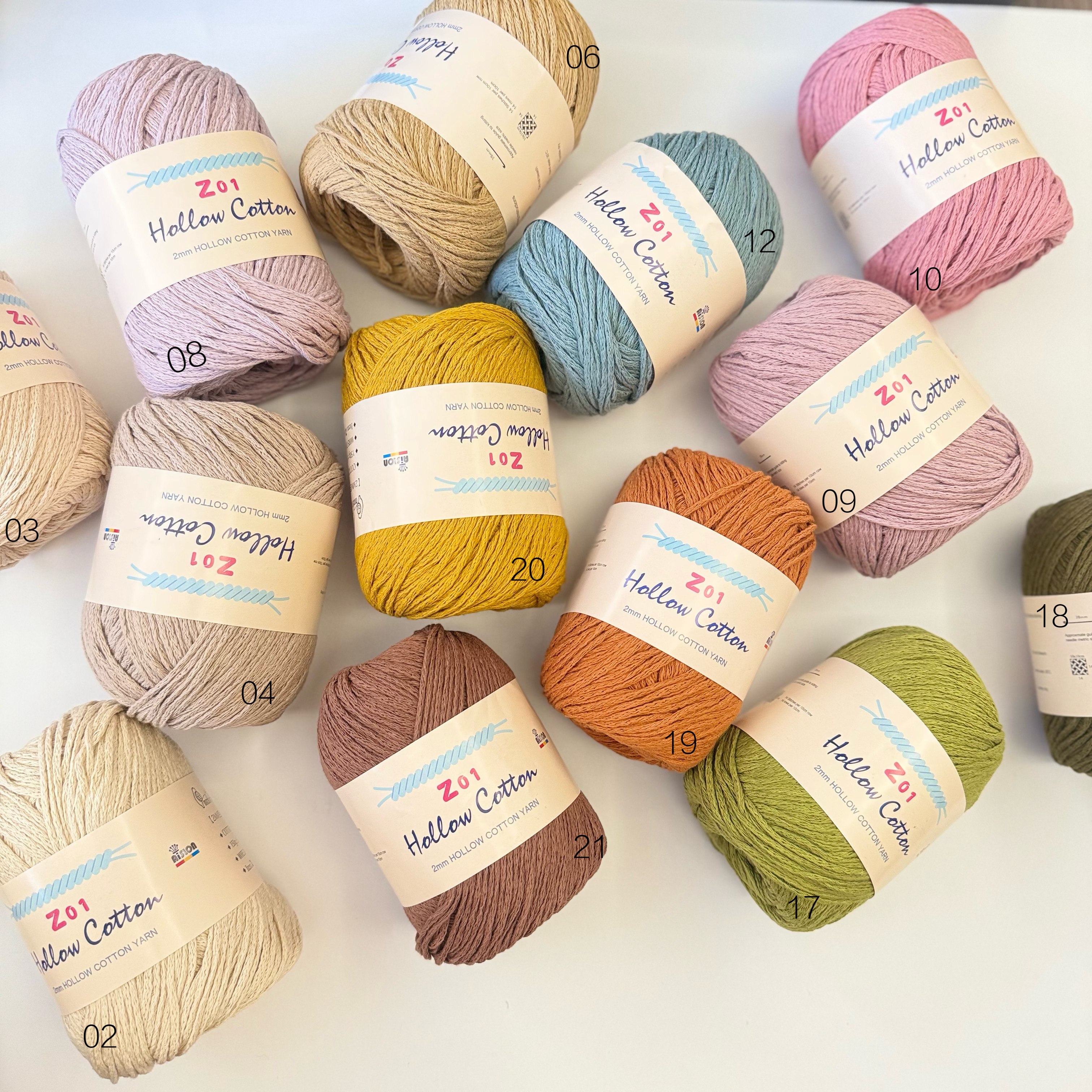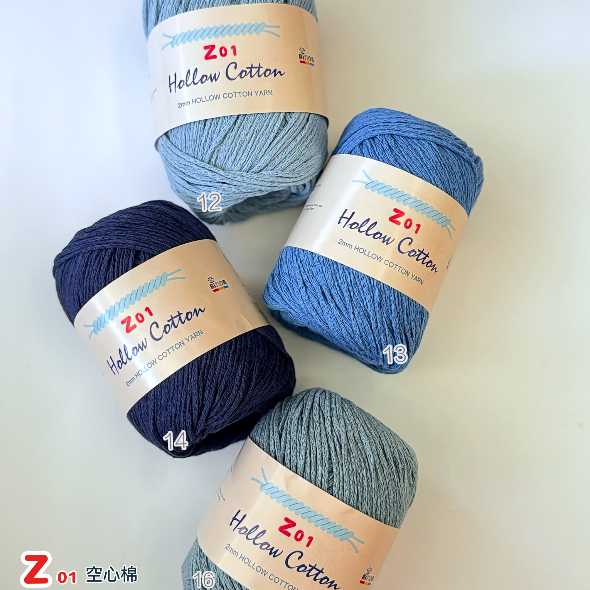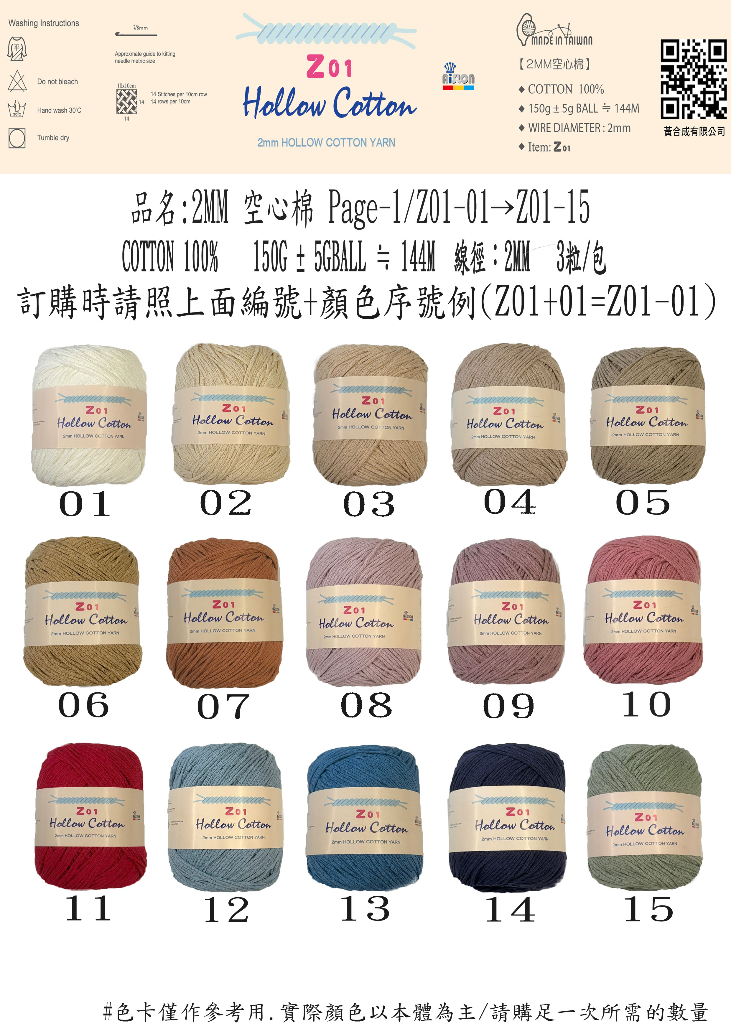 2MM空心棉 Z01 150G ±5G≒144M COTTON100% 共24色 3顆/包 勾針7~8號 建議售價:280元/(顆)